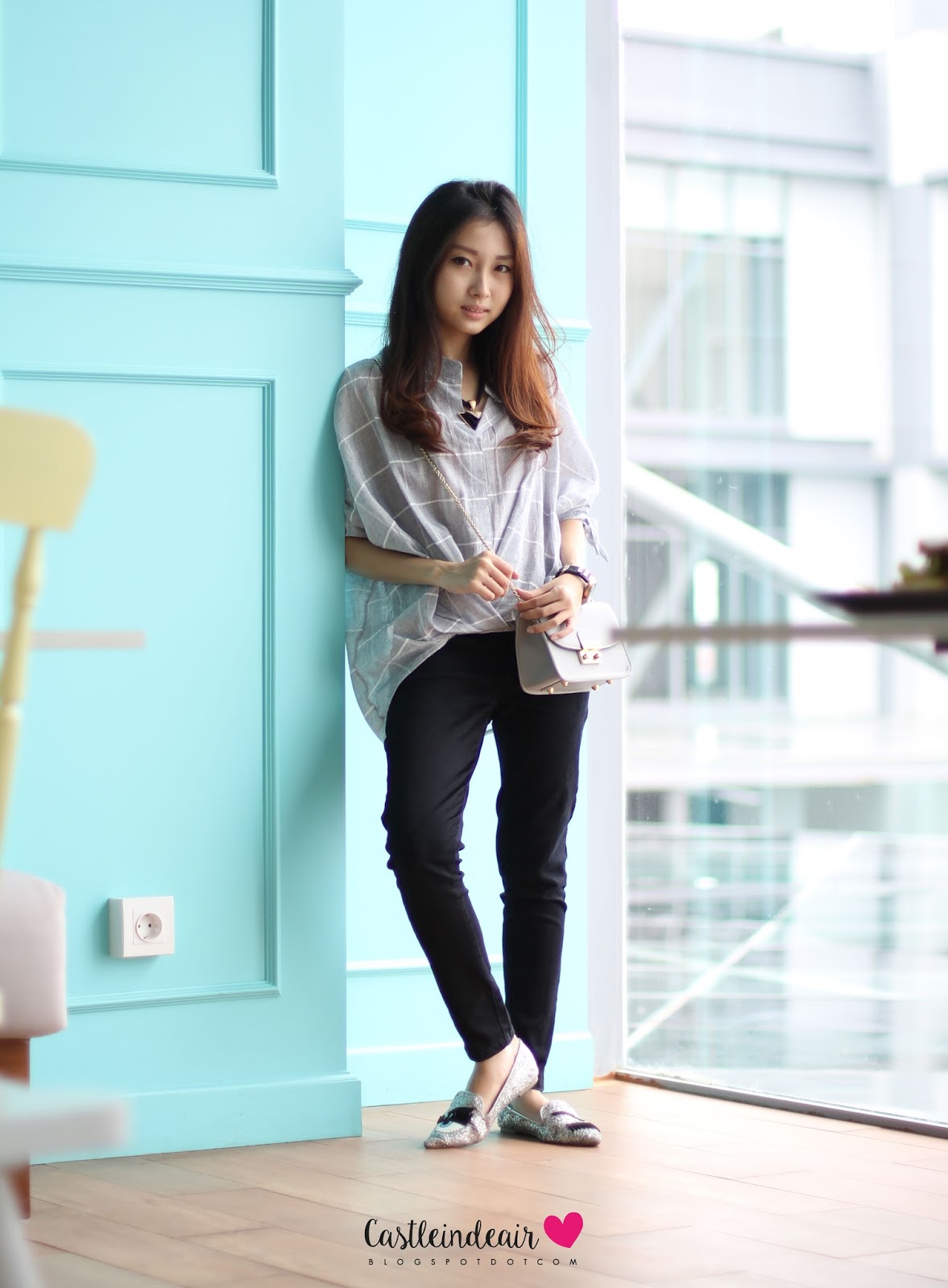 Jadi dalam blogpost ini, aku pakai oversized grey shirt dengan motif kotak-kotak. Well, aku beli kemeja ini soalnya ada tugas gereja yang dresscode-nya kotak-kotak. Nah, aku kehabisan baju kotak-kotak waktu itu, jadi beli deh akhirnya. Bajunya unik banget soalnya ada ada variasi di bagian depannya, tapi simple as well. Then, I paired it with my high waist super black jeans. Karena bagian depannya agak pendek, aku pakai high waist pants untuk menutupi peyutku. Hahaha.